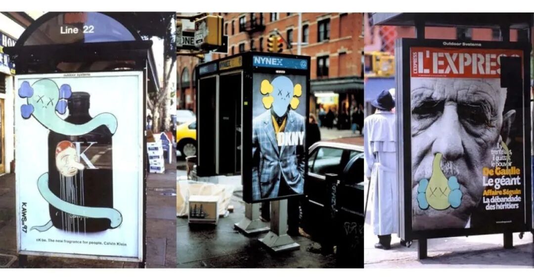 KAWS与一般人在墙壁、地铁、火车上涂鸦不同,他却在广告画或海报上 (例如DKNY, Calvin Klein) 加上自己著名的头骨Skull与交叉腿骨的图形Crossbones涂鸦图案, 甚至直接在户外广告牌、电话亭广告商涂鸦。