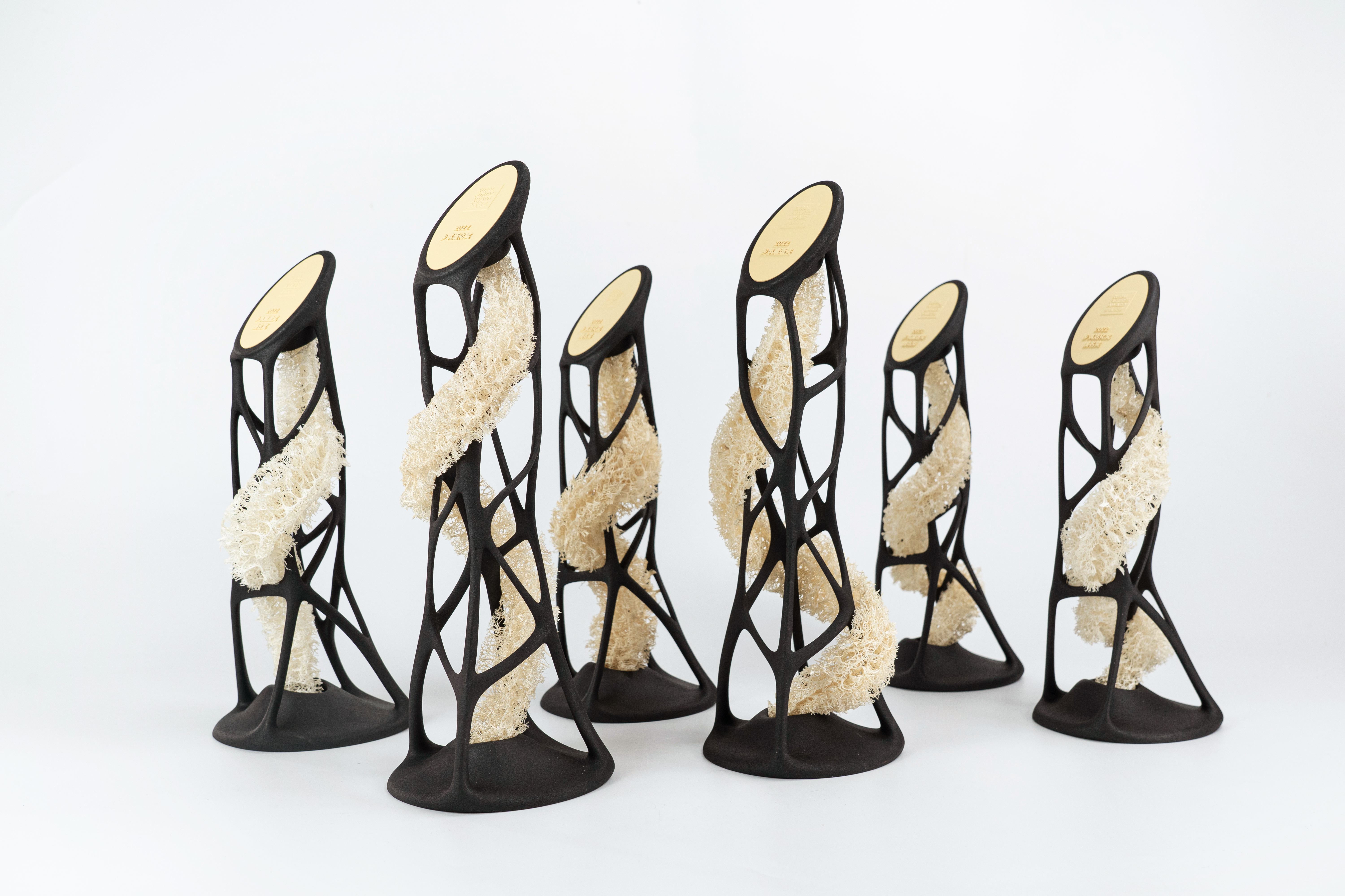 wenext运用3D打印科技,为丝络奖杯提供制作服务。奖杯主体采用未来7500高性能尼龙及红蜡材料,通过MJF多射流熔融3D打印技术实现产品落地,最大程度还原了丝络奖杯独一无二的艺术创意。